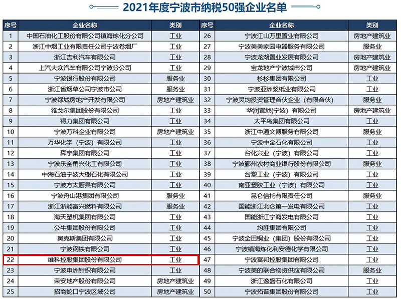 Recently, Ningbo Municipal Bureau of economy and information technology released the list of "top 50 tax paying enterprises in Ningbo in 2021", and Veken group was once again ranked 22nd, up nearly 20 places from 2020.