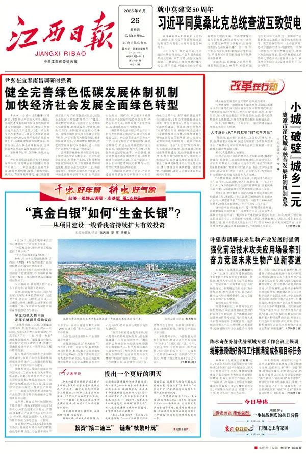 大江網(wǎng)/大江新聞客戶(hù)端訊 江西日?qǐng)?bào)全媒體記者魏星報(bào)道:625日,省委書(shū)記尹弘深入宜春、南昌,圍繞推進(jìn)綠色低碳發(fā)展體制機(jī)制改革進(jìn)行專(zhuān)題調(diào)研。他強(qiáng)調(diào),要深入貫徹習(xí)近平生態(tài)文明思想,以進(jìn)一步全面深化改革為動(dòng)力,健全完善綠色低碳發(fā)展體制機(jī)制,提升產(chǎn)業(yè)綠色低碳發(fā)展水平,構(gòu)建碳排放雙控制度體系,加快經(jīng)濟(jì)社會(huì)發(fā)展全面綠色轉(zhuǎn)型,讓綠色成為江西高質(zhì)量發(fā)展的鮮明底色。
