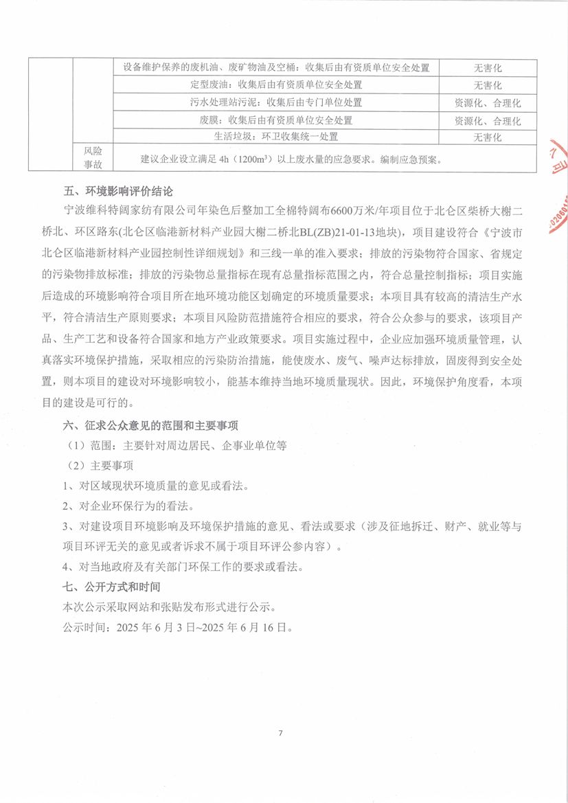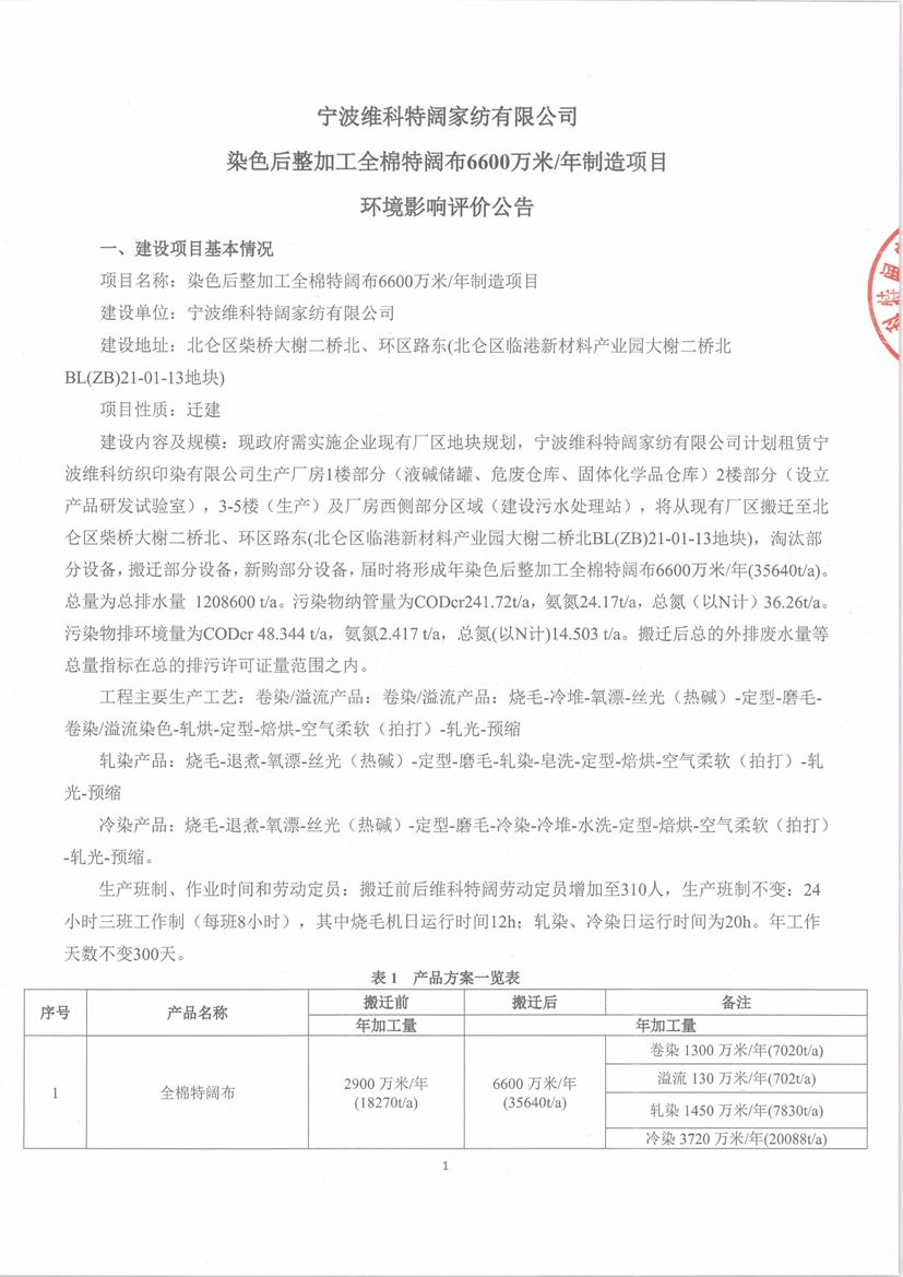 我公司的《寧波維科特闊家紡有限公司染色后整加工全棉特闊布6600萬米/年制造項目環(huán)境影響報告書》已完成編制,根據(jù)《浙江省建設(shè)項目環(huán)境保護(hù)管理辦法》(2021年修正)(省政府令第388號),現(xiàn)對項目主要內(nèi)容進(jìn)行公示。