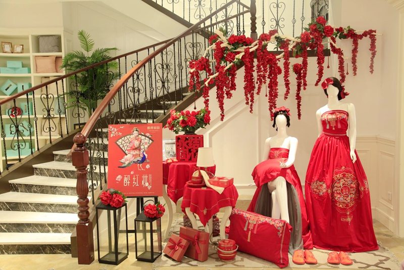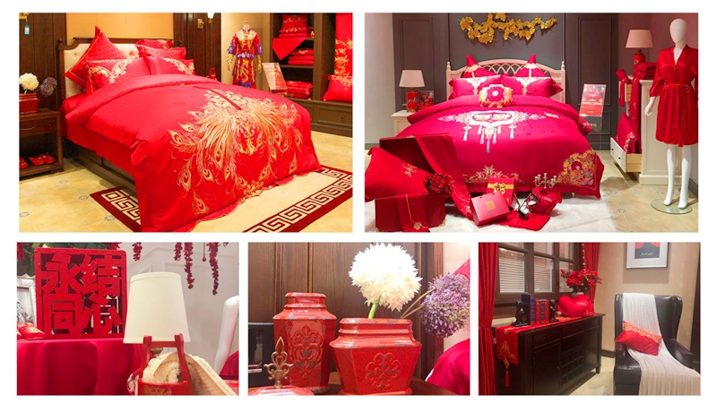 為帶給顧客更直觀舒適的消費(fèi)體驗(yàn),在空間設(shè)計(jì)上,維科家紡和義店二樓婚慶家紡場(chǎng)景展示區(qū)摒棄了家紡行業(yè)傳統(tǒng)高柜+展床以求陳列面最大化的方式,將300余平方的空間分隔成7個(gè)實(shí)景樣板間,真實(shí)體現(xiàn)婚慶床品在日常家居生活中的應(yīng)用效果,也能滿足顧客在選購婚慶床品的同時(shí),一站式解決對(duì)婆婆禮、長輩禮以及婚慶小件(子孫桶、火銃、虎頭鞋等)的需求。該區(qū)域設(shè)置了一大一小兩個(gè)洽談區(qū),配備了舒適的沙發(fā)以及精致的茶歇,以供顧客能夠坐下來向?qū)з徳敿?xì)了解床品的信息,以優(yōu)質(zhì)的消費(fèi)體驗(yàn),滿足顧客的選購需求。在陳列布置上,當(dāng)季新品醉紅妝、子孫滿堂、胭脂醉,熱銷品百子納福、麒麟賀滿堂等都直接鋪設(shè)于房間內(nèi),并搭配生活化的情景道具,供顧客選購。
