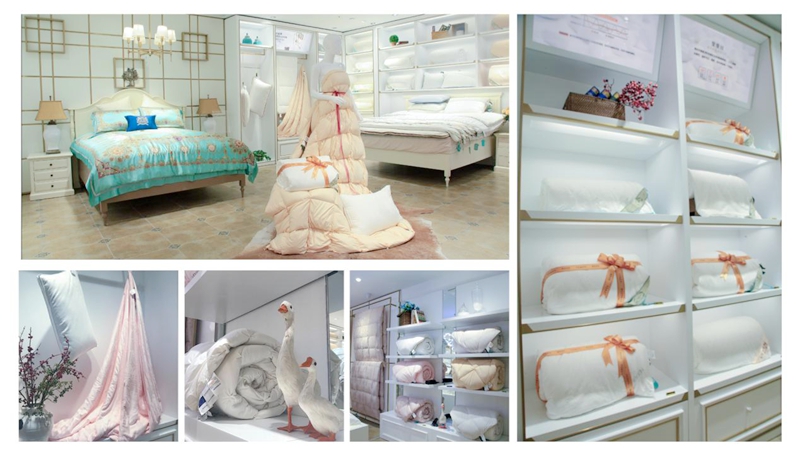 芯類產(chǎn)品一直以來都是家紡行業(yè)銷售的大頭,為進(jìn)一步提高和義店芯類產(chǎn)品銷售業(yè)績,公司對(duì)一樓原有空間進(jìn)行重新規(guī)劃,特別開辟了80余平方的獨(dú)立芯類區(qū),設(shè)計(jì)上采用白色貨柜、鍍鈦金屬件、金屬玻璃柜的組合,使整個(gè)芯類區(qū)更加通透明亮。維科家紡主打的維科朵絨被、蠶絲被、石墨烯纖維被等都在該區(qū)域以展床、垂掛、卷筒等不同形式集中展示。此外,售價(jià)近三十萬的鎮(zhèn)店之寶——至尊冰島雁鴨絨被,也首次亮相和義店。