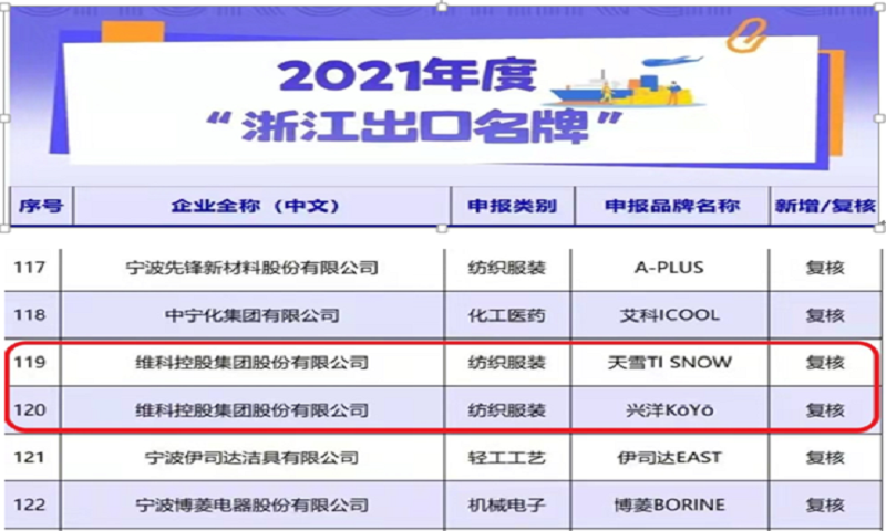 維科集団の興洋KōYō、天雪TISNOWブランドが2018年度浙江輸出ブランドを獲得