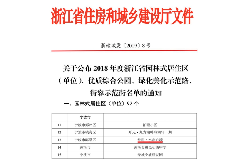 先日、浙江省住宅と都市と農(nóng)村建設庁は「2018年度浙江省園林式居住區(qū)(単位)、良質(zhì)総合公園、緑化美化モデル道路、街容モデル街リストの通知」を発表し、維科水岸心境団地がランキングになり、2018年度浙江省園林式居住區(qū)を獲得し、寧波市の計9社の企業(yè)や事業(yè)単位がこの栄譽を獲得したが、海曙區(qū)は水岸心境団地だけだった。